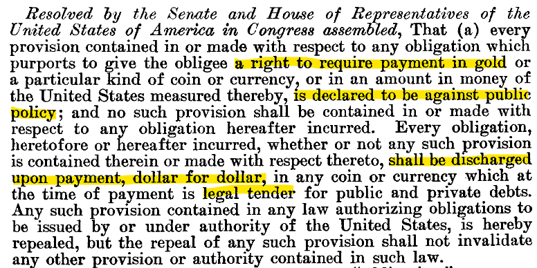 Many bitcoiners are familiar with FDR's April 5, 1933 Executive Order 6102 criminalizing private possession of gold. (Indeed, Bitcoin's pseudonymous creator listed his birthday as April 5th.) Less well-known, however, is Congress's joint resolution of June, 1933, which invalidated all gold clauses as contrary to public policy: