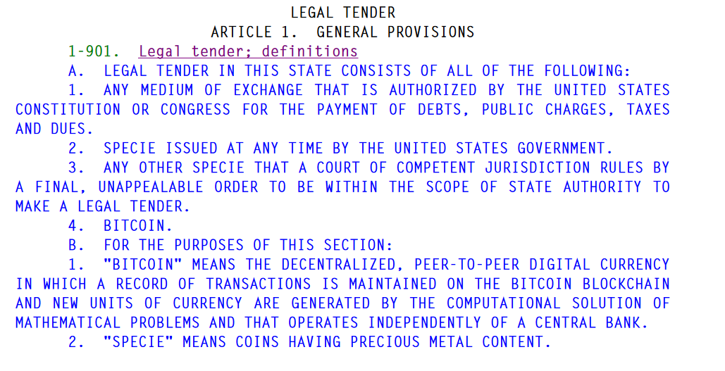 Governors of Colorado and New Hampshire are exploring Bitcoin-related laws. The legislatures of Arizona and California have introduced bills addressing the use of Bitcoin in some way.[2] California would let Bitcoin (and other cryptocurrencies) be used to pay taxes. And Arizona's proposed bill goes even further, expressly declaring Bitcoin (and only Bitcoin) legal tender within the state[3]: