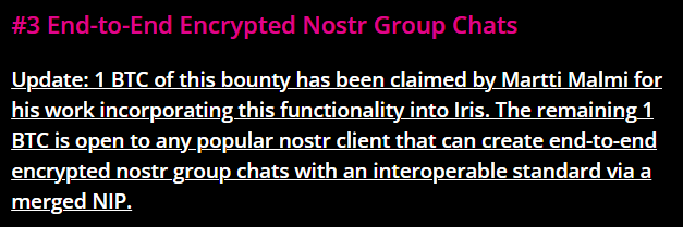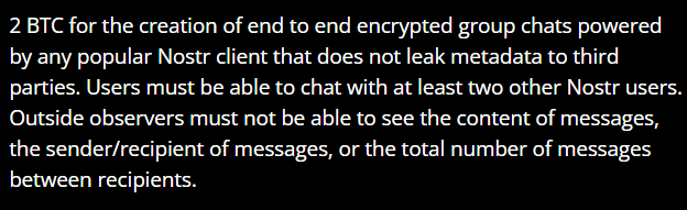 The example given was the Human Rights Foundation's bounty for "End-to-End Encrypted Nostr Group Chats," which gave only a short description of what solution would satisfy the bounty:
